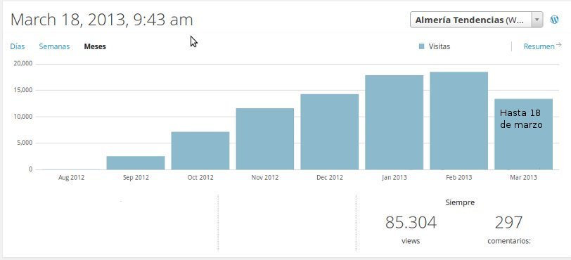 Estamos felices, porque en seis meses hemos llegado a 85.000 visitas a Almería Tendencias, de las que unas 32.000 pertenecen al último mes y medio (Casi el 40%). El día que batimos el último récord fue el pasado 13 de marzo, que casi llegamos a 2.000 visitas, coincidiendo con el post de El Brunch de las once. Seguramente se volverá a batir en breve. Sí, son cifras relativamente modestas, pero sabemos que es mucho mejor que la que ‘venden’ otras web locales con más infraestructura y contenido.