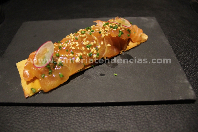 Pizza de sashimi de salmón marinado, algas wakame y vinagreta de wasabi y aove – iván abril – bacus